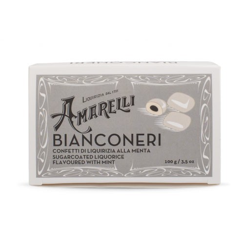 La classica confezione in astuccio in cartone, contiene i “Bianconeri”, delle deliziose favette di liquirizia alla menta confettata con un sottile strato di zucchero.