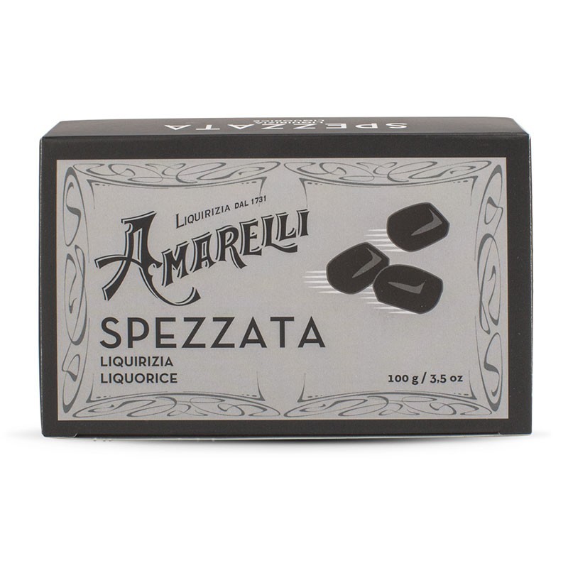 La classica confezione in astuccio in cartone, contiene la “Spezzata Pura”, Liquirizia dal gusto intenso e inconfondibile in pezzi irregolari.