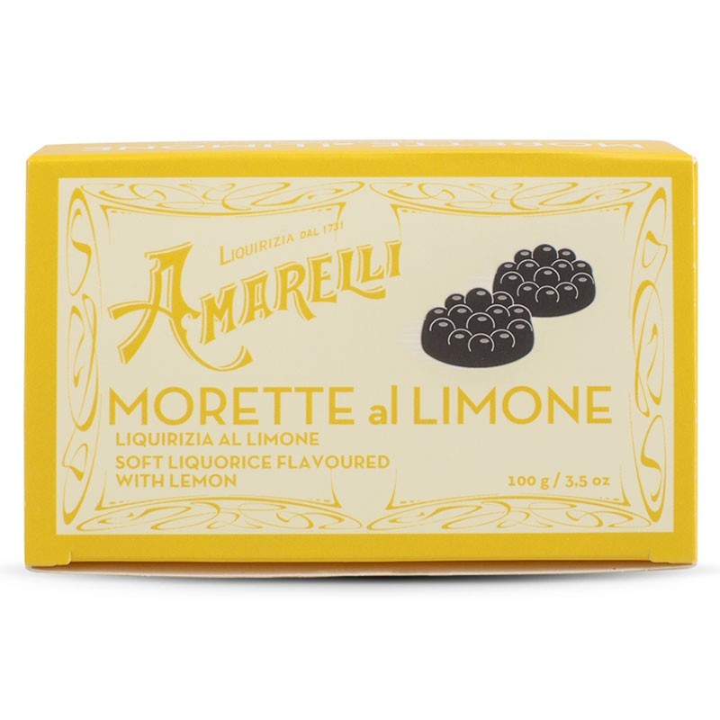 La classica confezione in astuccio in cartone, contiene le “Morette al Limone”, piccole more di liquirizia resa morbida da preziosa gomma arabica e profumata con aroma naturale di limone.