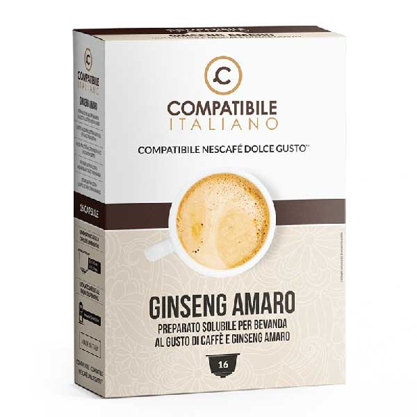 16 capsule per 16 bevande al gusto di Ginseng Amaro (attenzione: contiene saccarosio) già pronte da erogare con la tua macchina da caffè espresso a sistema Nescafé* Dolce Gusto*.