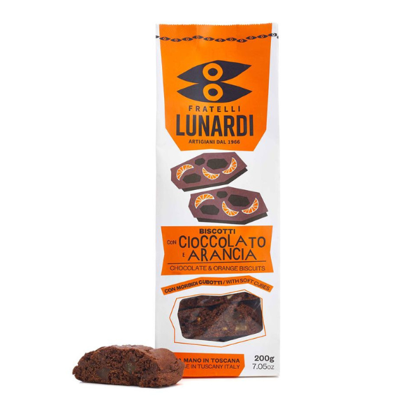 Cantucci teneri con il 25% di cioccolato e morbidi cubotti di arancia italiana candita.