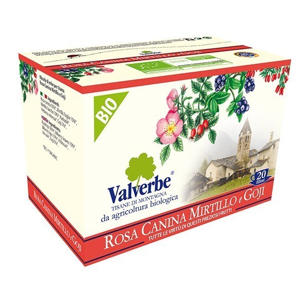 Ingredienti: Rosa canina (Rosa canina L.) frutti 50%*, Mirtillo nero (Vaccinium myrtillus L.) foglie 15%*, Mirtillo nero (Vaccinium myrtillus L.) bacche15%*, Karkadè (Hibiscus sabdariffa L.) fiori*, Verbena odorosa (Lippia citrodora Lam. Kunth.) foglie*, Goji (Lycium barbarum L.) bacche 5%*. [*BIO]