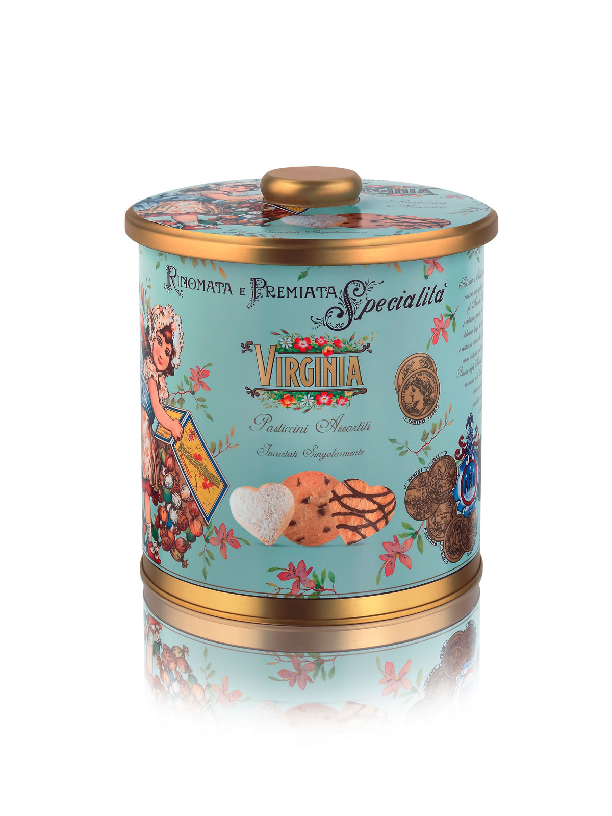 Un golosissimo assortimento di quattro diversi pasticcini: un cuore al burro, un cuore decorato con cioccolato fondente, un tondo con le gocce di cioccolato e un canestrino alla nocciola. La garanzia di qualità della produzione di Casa Virginia è data dalla secolare esperienza dolciaria, dalla selezione accuratissima di ingredienti di prima qualità e dal rispetto della ricetta della tradizione in tutte le sue Creazioni Dolciarie. Tutti questi pasticcini sono incartati singolarmente per preservarne le caratteristiche organolettiche e la durata di 12 mesi. La confezione è talmente bella nei colori e nella grafica che potrebbe rappresentare una graditissima idea regalo, inoltre si tratta di una vera e propria biscottiera ermetica in metallo, che oltre a far bella mostra di sé in qualsiasi cucina, ha anche un suo utilizzo funzionale intrinseco.