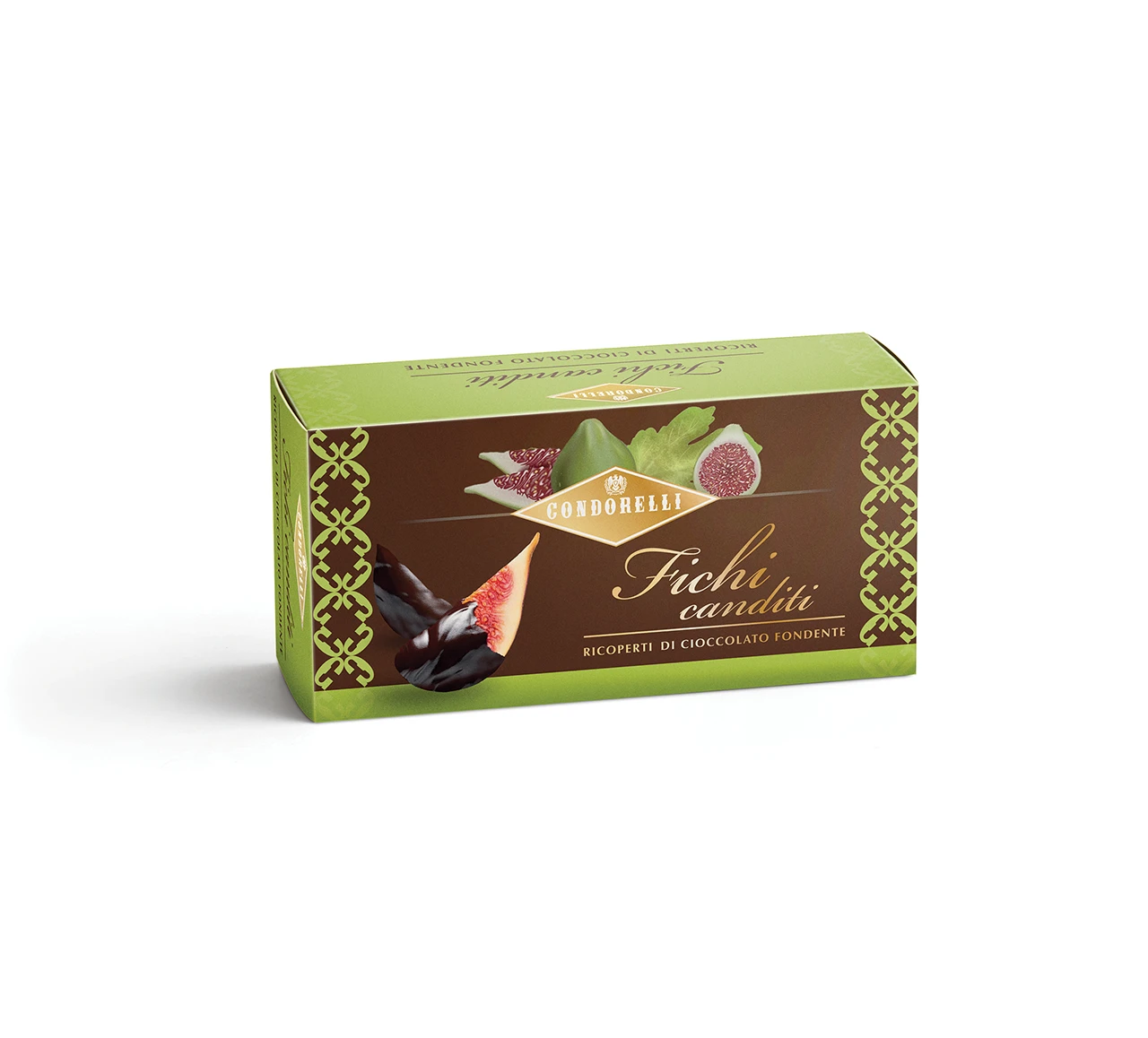 Spicchi di fichi canditi a mano e ricoperti di cioccolato fondente.