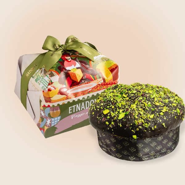 Dolce da forno al cacao farcito con crema al pistacchio salato, ricoperto di cioccolato fondente e granella di pistacchio salato.